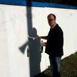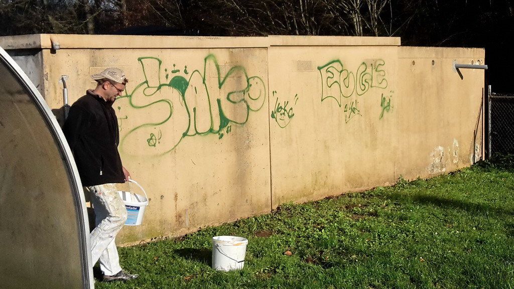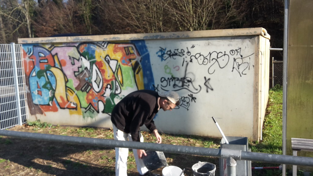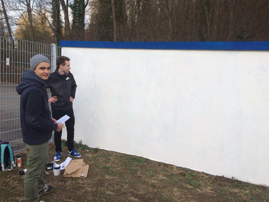 Die alte baufällige Garage wurde abgerissen. Dahinter kam ein Garage zum vorschein, die nicht viel besser aussah. Wir haben sie gestrichen (natürlich in Alemannia Farben) und somit die Grundlage geschaffen für eine neue Wandgestaltung. Dieser hat sich Luis K. angenommen und ist echt cool geworden! Vielen Dank an dieser Stelle an Luis für Sein Kunstwerk!